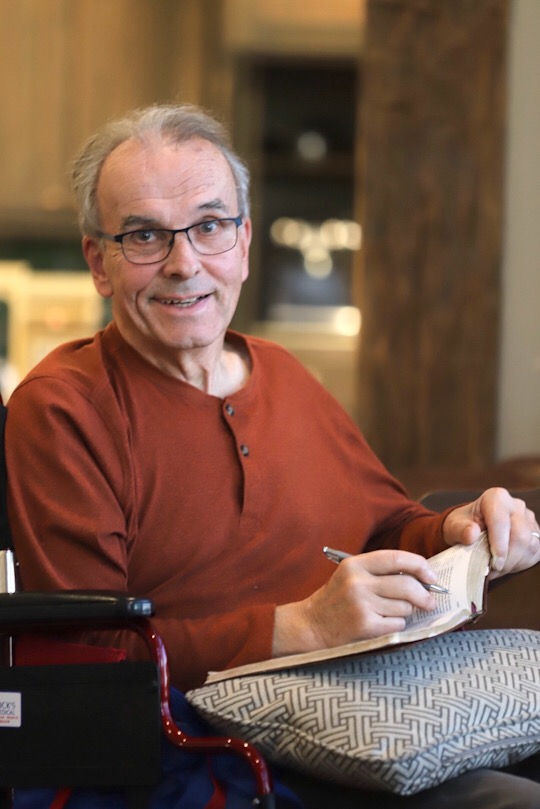 Here is my dad, January 2020, unable to talk more than a few words, read or walk- but still finding comfort in at least looking at God’s word and underlining (random) words. He had spent hours a day like this before his condition, so it’s no surprise it was his favorite thing to do as it progressed.